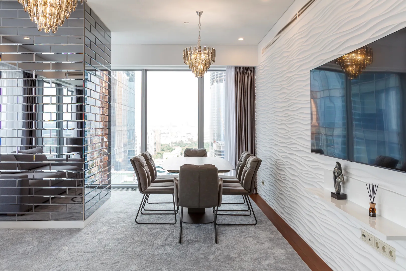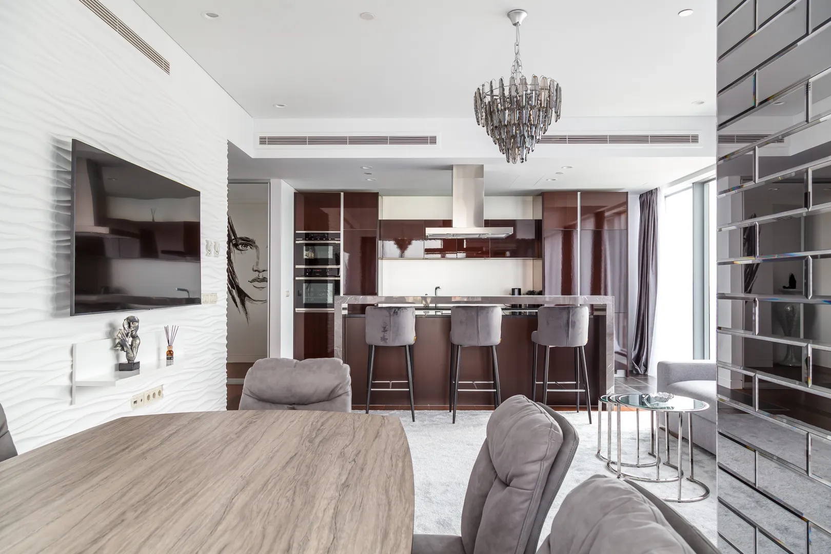 Сдаю красивый угловой апартамент в башне око в москва-сити! С окна открывается замечательный вид на башни москва-сити с одного угла, и на город - с другого угла! Закатная сторона! В апартаменте есть все необходимое для проживания, спальных мест 4+1 (кровать в спальне, раскладной пуф, и раскладной диван в гостиной). Бельё, уборка, посуда все входит в стоимость. Цена указана при размещении гостей до 4 человек, если у вас мероприятие - нужно сообщить точное количество гостей, за каждого гостя сверх 4 чел есть доплата - 1500/чел. Также при заселении взимается залог 5т, при большом количестве человек -10т. Апартаменты состоят из гостиной, совмещенной с кухней с барной стойкой, отдельной спальни, гостевого туалета, холла, основного санузла с панорамными окнами. В день заселения встречу на месте, все покажу, расскажу!
