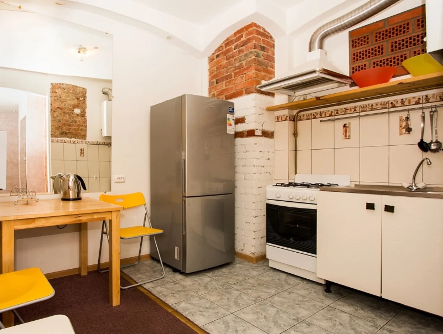 В квартире выполнен дизайнерский ремонт. Первая комната зонирована: двуспальная кровать отделена от второй половины комнаты балдахином. За ним находится односпальный диван, компьютерный стол с офисным креслом. Во второй комнате - двуспальный диван, телевизор с тумбой, платяной шкаф с зеркальной дверью. Кухня выполнена под старину, с выступающей кирпичной кладкой. Кухонный гарнитур дополняется обеденной зоной. Санузел раздельный, с ванной, в плитке до потолка - евростандарт. Газовая плита, кондиционер, металлическая дверь, домофон, свч печь, электрический чайник, утюг с гладильной доской, фен.