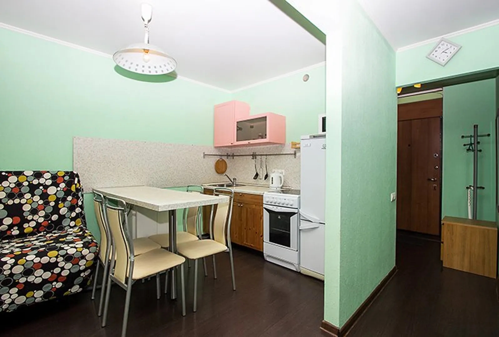 Квартира-студия отличается оригинальной планировкой. Двуспальная кровать находится в нише и отделяется от комнаты плотной шторой, что делает квартиру удобной для размещения двух пар или отдельных людей. В другой части комнаты – двуспальный диван, журнальный столик, тумба с телевизором, шкаф для одежды. На кухне – гарнитур и обеденная зона в виде барной стойки со стульями. Санузел совмещенный с ванной в плитке до потолка, сделан по евростандарту. В квартире огромная лоджия и удобная прихожая с вешалкой для одежды. электроплита, кондиционер, металлическая дверь, домофон, свч печь, электрический.