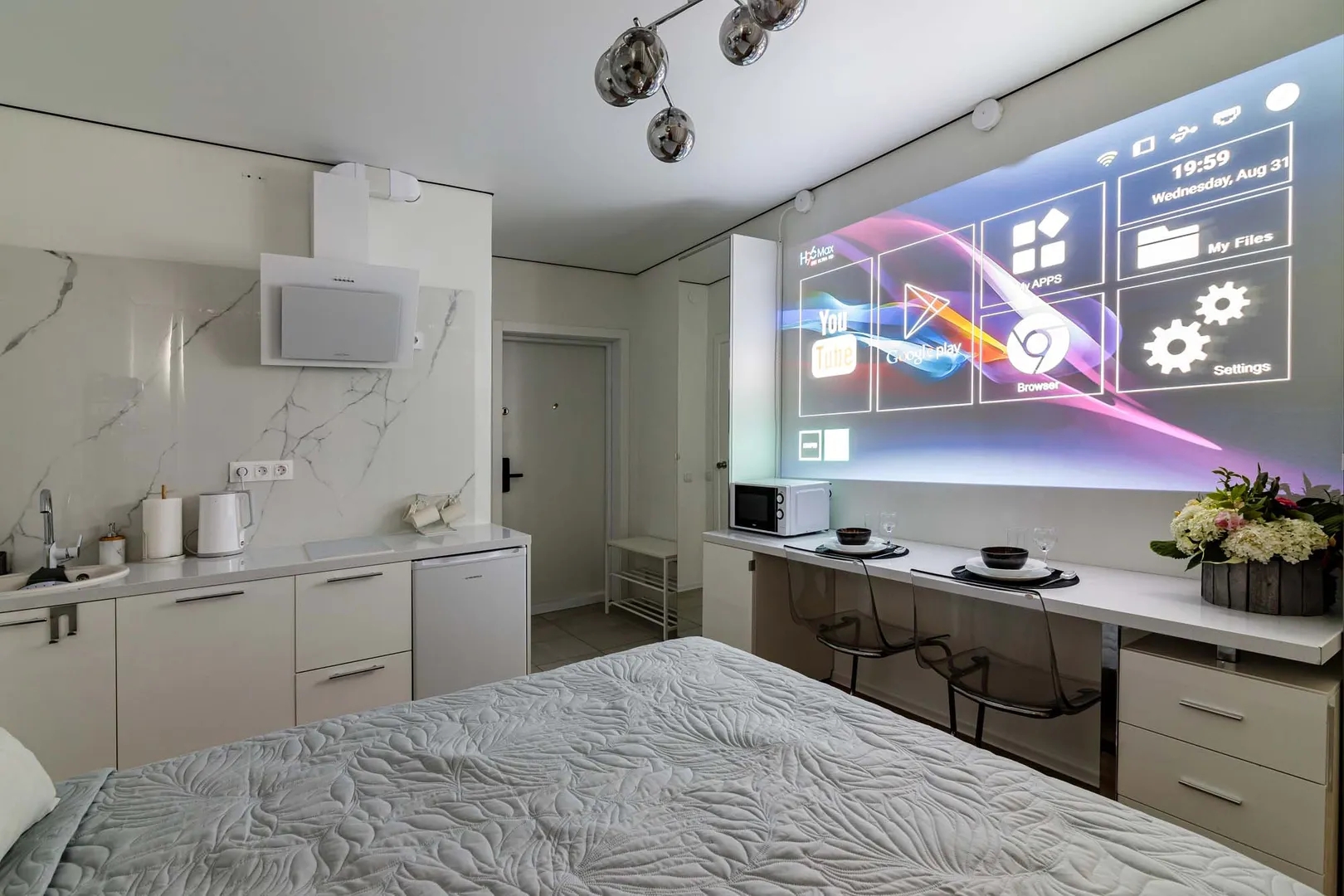 Уникальная студия с современным дизайном и необычными техническими решениями. В студию интегрирована система "умный дом", которой можно управлять с помощью Алисы и простых голосовых команд. Одной из главных изюминок студии является домашний кинотеатр. Вместо телевизора установлен проектор и можно смотреть любимые передачи или кино на "широком экране". Для чёткого изображения даже днём, в квартире есть шторы, которые не пропускают свет. Размер экрана 2,5 м. на 1,5 м. В доступе более 1000 бесплатных фильмов. Светлая квартира - студия совмещает в себе спальню, кухню и даже рабочую зону. Дизайн интерьера выполнен в стиле лофт с наружной проводкой и использованием материалов, похожих на камень и дерево. Напротив удобной двуспальной кровати располагается комод и шкаф для хранения вещей. Напротив кухни удобная обеденная зона. Поработать с компьютером можно на кровати, сидя в кресле или за обеденным столом. Квартира находится в новом ЖК от застройщика "ПИК". Удобная транспортная доступность, потому что недалеко от дома находится. МКАД.