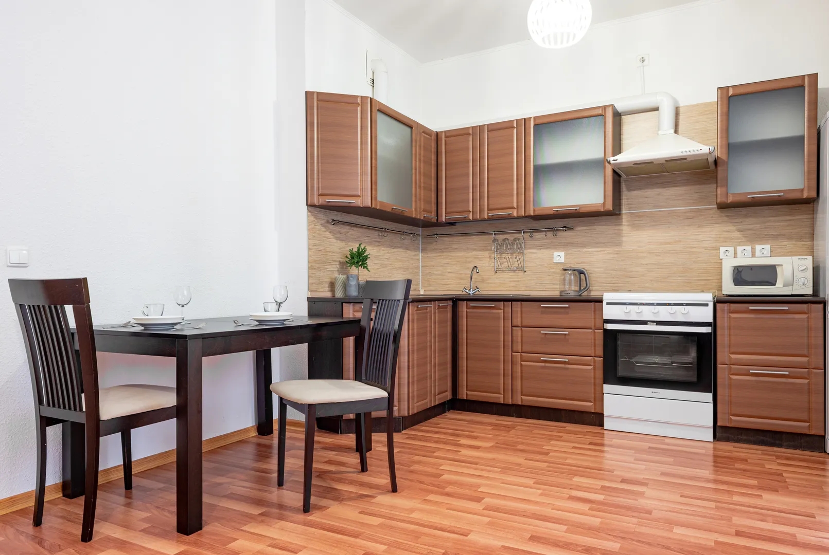 Кухня, оборудованная всей необходимой бытовой техникой и посудой.