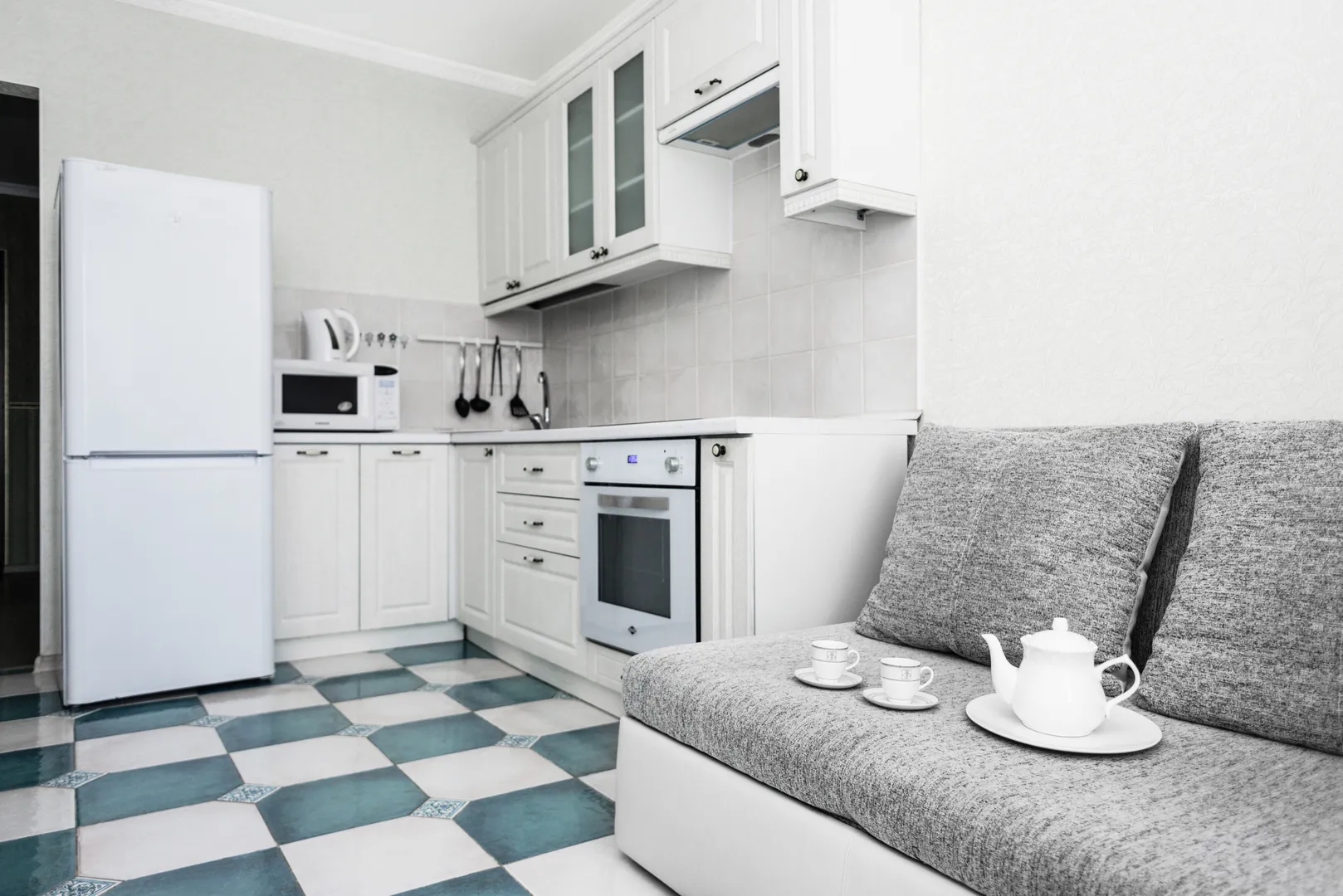 В кухне имеется диван и поэтому можно использовать квартиру как трехкомнатную