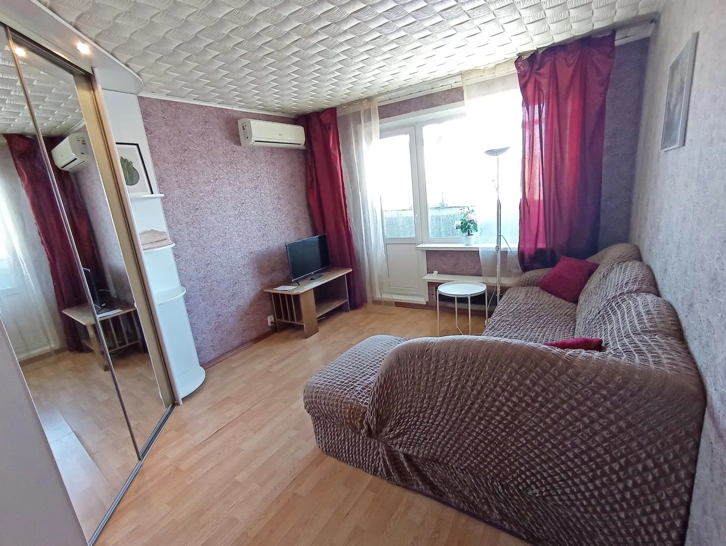 Квартира зонирована. Двуспальная кровать отделена от гостиной зоны большим зеркальным шкафом и позволяет с комфортом разместить четырех гостей. Диван можно разложить, дополнительный комплект белья предоставляется отдельно и стоит 250 рублей.