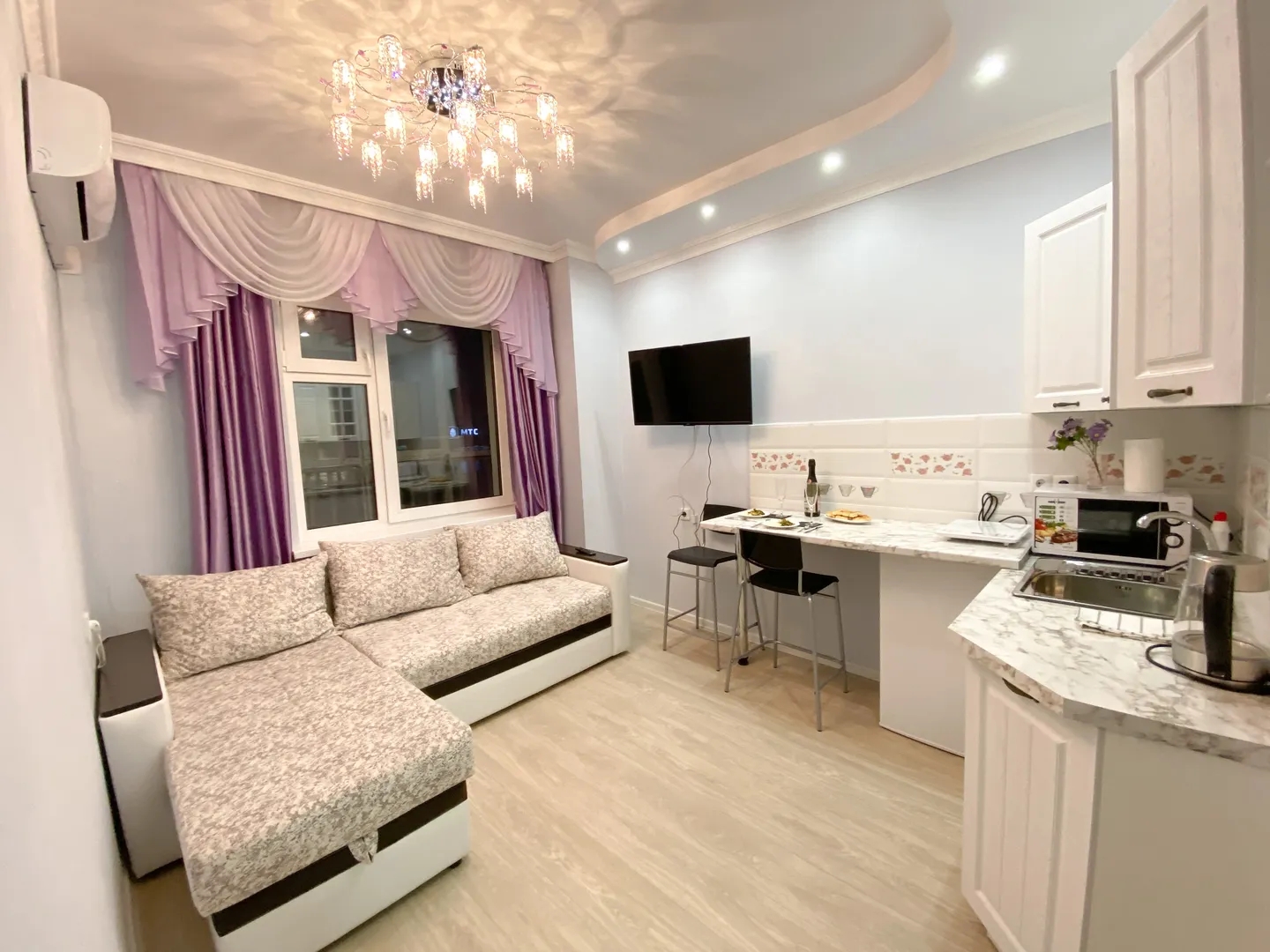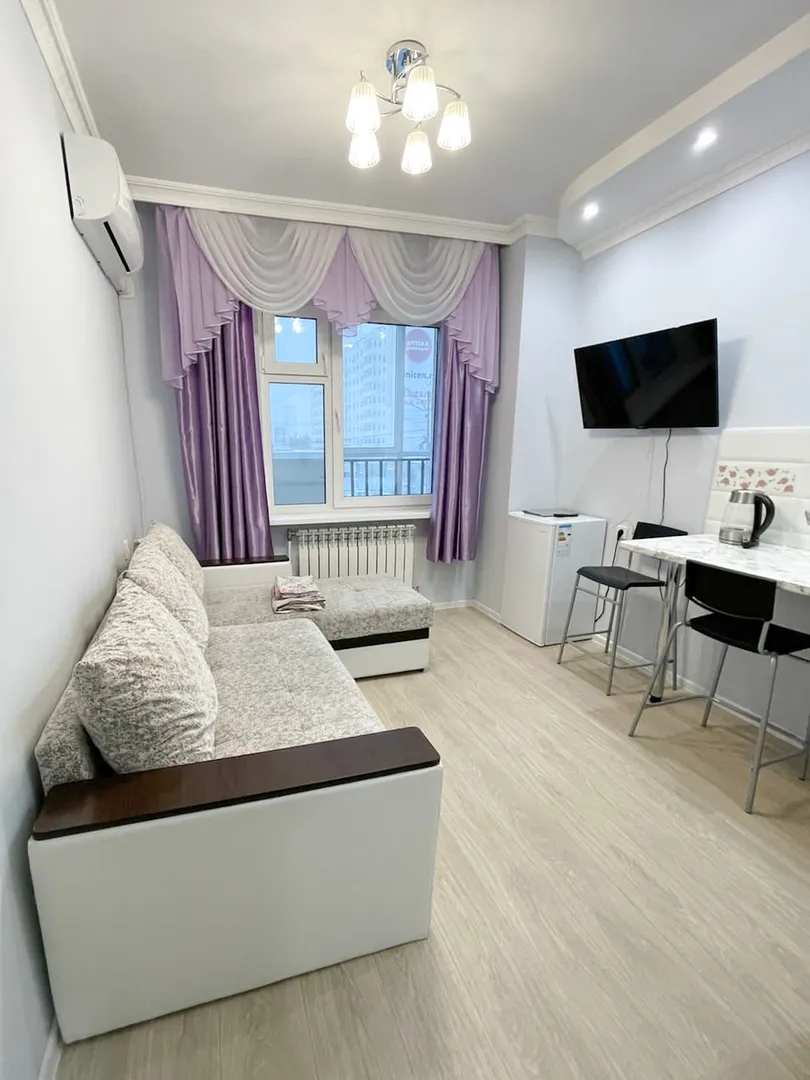 Светлая и чистая студия в центре Якутска с диваном-кроватью, собственной кухней, туалетом и душевой.