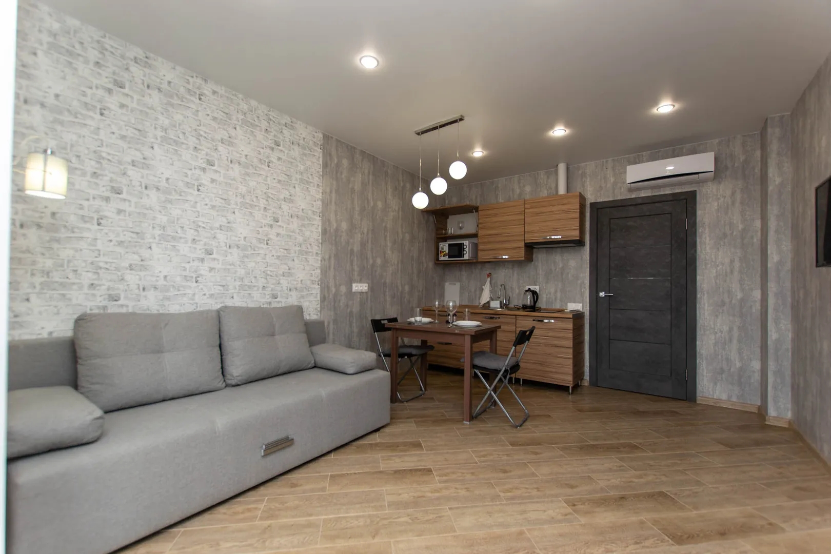 Уютная однокомнатная студия, расположенная на 10м этаже нового жилого комплекса. Панорамные окна с видом на город. Современное оборудование, кухонная зона с необходимой техникой, комплектация постельными и банными принадлежностями, комфортный двуспальный диван-кровать и обеденная зона создадут приятное впечатление и позволят насладиться прекрасным отдыхом в казани.