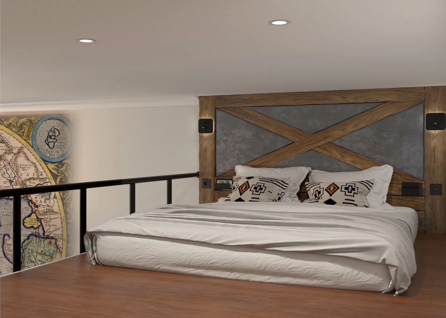 Двухуровневый номер-студия категории Делюкс площадью 20-25 м? предназначен для проживания 4-х гостей. На первом уровне располагаются: гостиная, мини-кухня и санузел, на втором – спальная зона. Окна номера выходят во двор. В номере: комфортный двуспальный диван; 2 двуспальных ортопедических матраса в спальной зоне на 2-ом уровне; постельное белье; мини-кухня с бытовой техникой (холодильник, индукционная плита, вытяжка, чайник, столовые приборы, кухонные принадлежности); чай, кофе, сахар, соль, специи; санузел с душем; фен; комплекты полотенец; тапочки; туалетно-косметические принадлежности (мыло, гель для душа, шампунь); шкаф для хранения вещей; сушилка для обуви; средства для чистки одежды; телевизор, Wi-Fi; сейф.