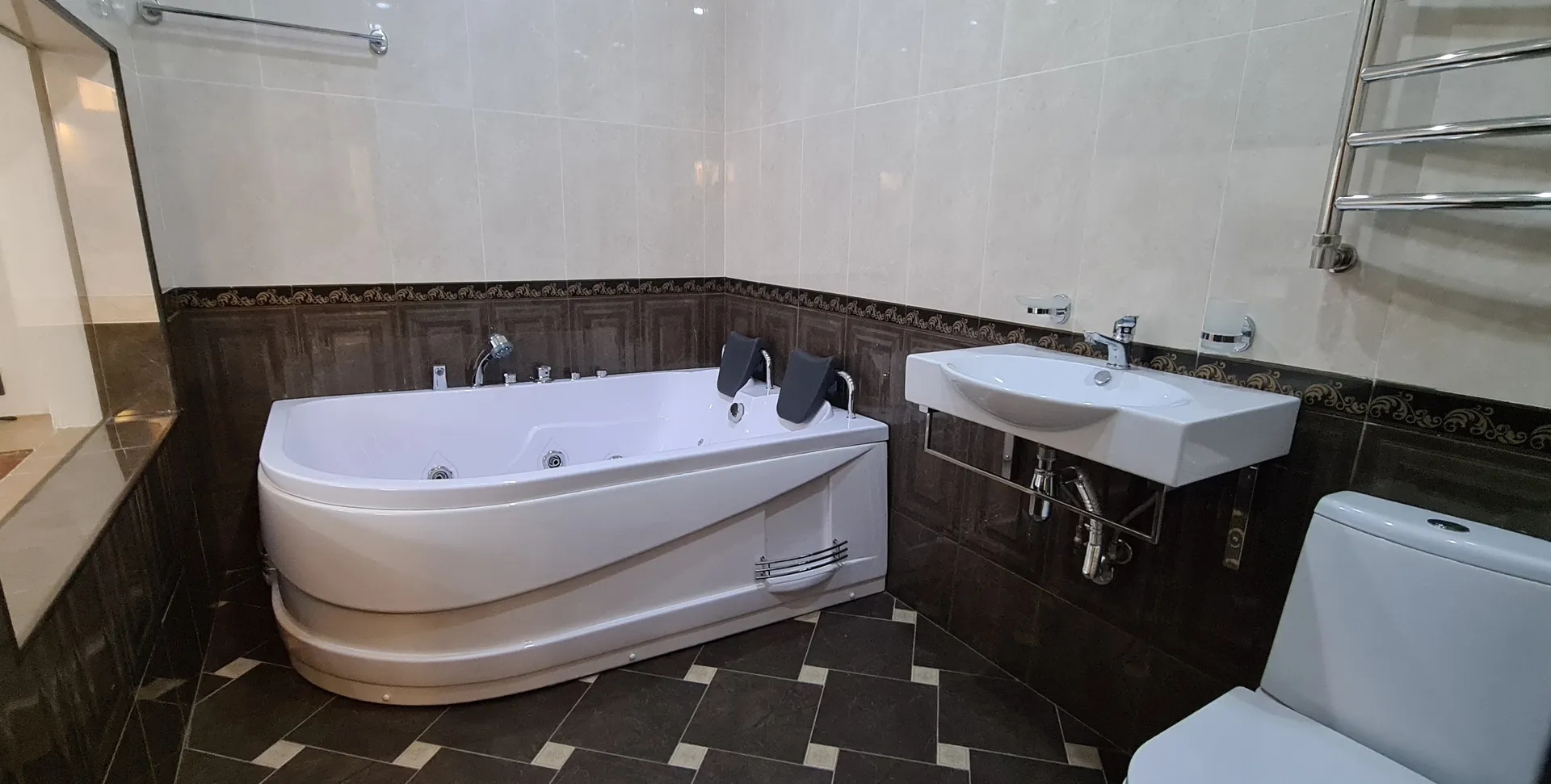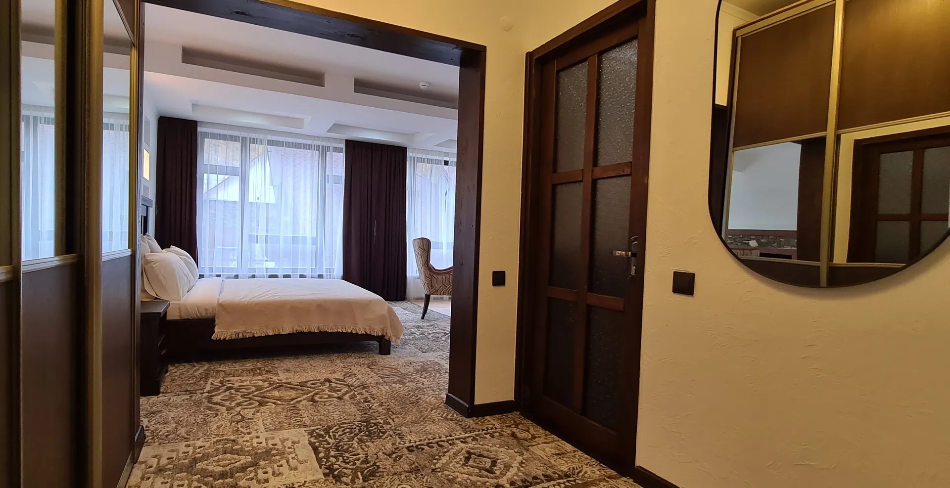 2 местный номер Люкс с камином, гидромассажной ванной и видом на горы. В номере есть большой санузел с окном в номер, большая кровать размера king-size, телевизор, холодильник, микроволновая печь, чайник, посуда, фен, постельное белье, полотенца, халаты, тапочки.