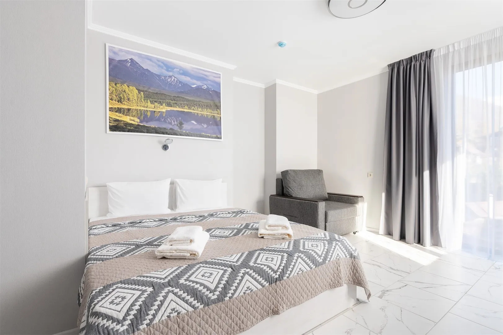 Уютный однокомнатный номер с видом на горы, в котором каждый наш гость сможет расслабиться и почувствовать себя, как дома. В номере созданы все условия для комфортного проживания – это мягкая двуспальная кровать или две односпальных кровати и удобное раскладное кресло, журнальный стол, шкаф-купе, стулья. Разумеется, предусмотрен кондиционер, холодильник, ЖК телевизор. Индивидуальный санузел оборудован душем. В стоимость номера входит бесплатный Wi-Fi и весь широкий спектр бесплатных услуг отеля, включая бассейн. По желанию гостя может быть предоставлен утюг и гладильная доска.
