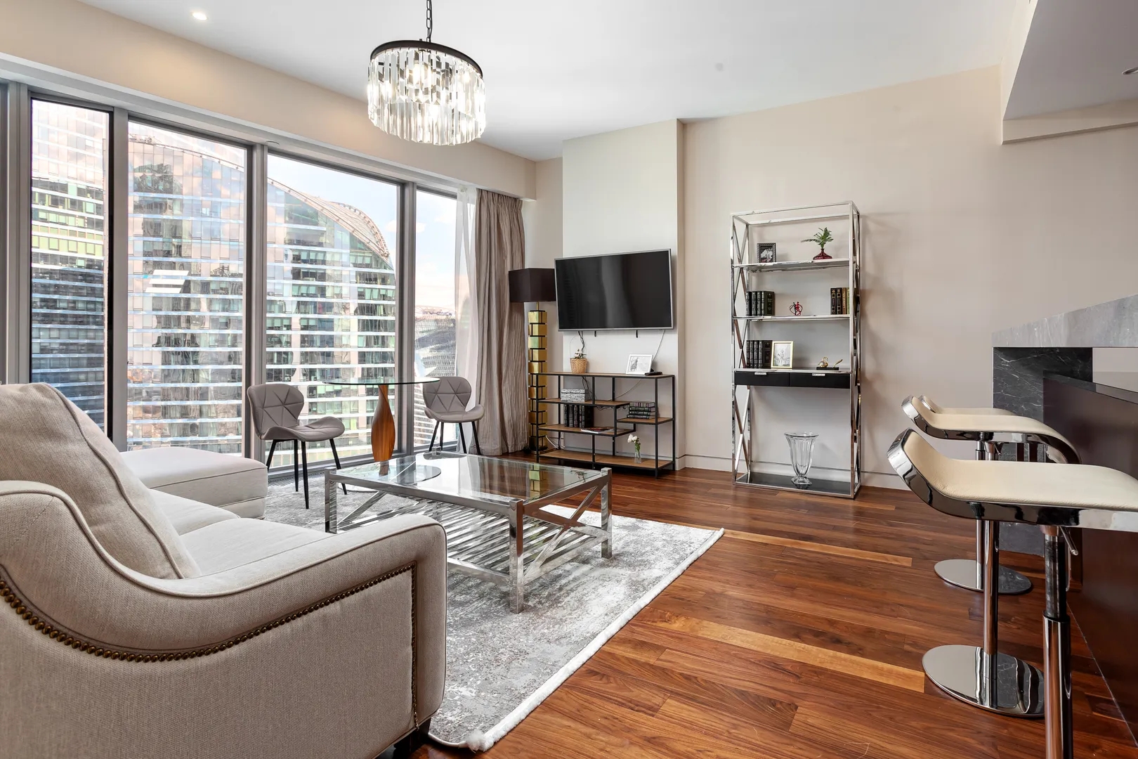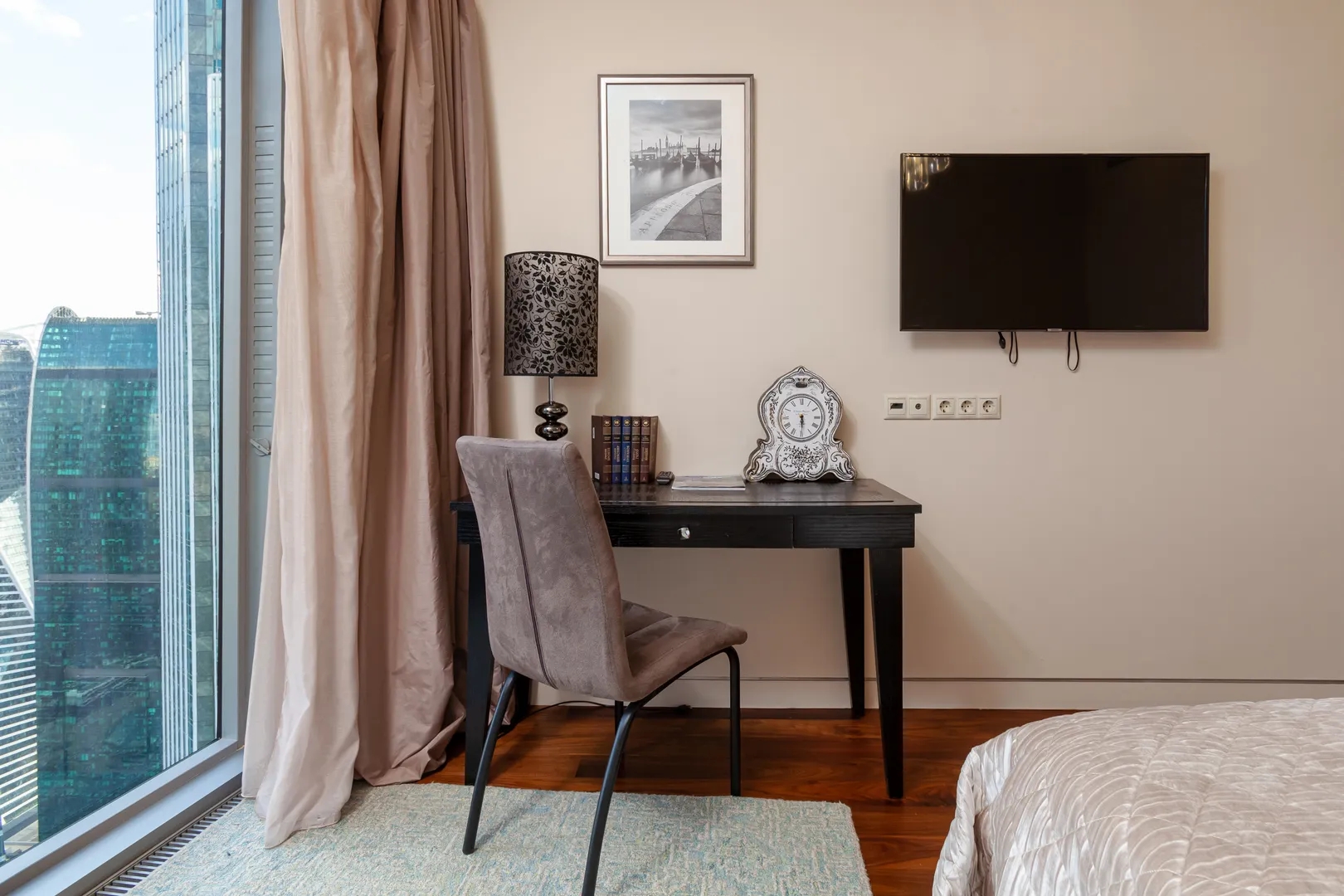 Двухкомнатный апартамент в башне "ОКО" Alruba 87 кв.м. на 51 этаже с панорамными окнами и видом на город и башни Москвы Сити. Кухня гостиная, полностью укомплектованная бытовой техникой, посудой и бокалами - микроволновка, духовка, плита, холодильник, морозильник, пространство для хранения. Кондиционер, Smart TV, WiFi, дизайнерская мебель. В спальне двуспальная кровать и вход в ванную комнату, в гостиной раскладывается диван. Гостевой туалет в коридоре. Включены тапочки, халаты, чай, кофе, гигиенические и зубные наборы. Доступ на этаж во время проживания для совершеннолетних гостей по паспортам, указанных при бронировании. Время возврата страхового залога (5000 рублей при заезде) - в течении 3-7 дней (ожидаем информацию по сданным картам доступа) Паркинг по запросу. В шаговой доступности - топовые рестораны - Ruski на 84 этаже, Six Voice, Фитнес с бассейном Небо на 61 этаже башни Федерация, вся инфраструктура Москвы Сити. Будем рады Вашей брони и с удовольствием ответим на все вопросы! :)