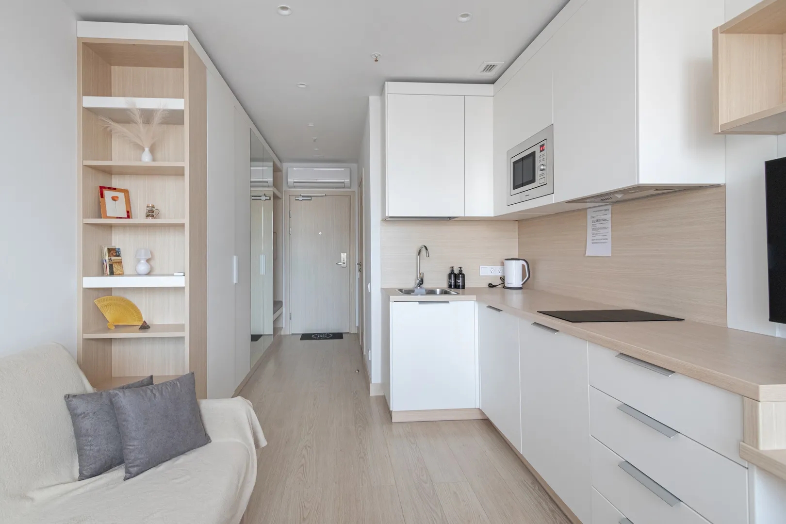 Апартаменты с дизайнерским ремонтом в современном Апарт-отеле в YES Технопарк, в шаге от станции «Технопарк» Замоскворецкой линии метро. Апарт-отель YE’S располагает собственной инфраструктурой: не выходя из апарт-отеля вы можете посетить фитнес-центр с бассейном, ресторан и кафе. Из окна открывается отличный вид на город. Апарт-отель YE’S Технопарк расположен в современном динамично развивающемся районе. Деловой комплекс Nagatino i-Land располагается в пяти минутах пешком от апарт-отеля. Бизнес-парк является вторым по величине объектом московского рынка офисной недвижимости после делового центра «Москва-Сити». В Nagatino i-Land открыты офисы ведущих российских и международных компаний, многочисленные рестораны, кафе, фитнес-центры. Парк развлечений «Остров мечты» открыт через дорогу от апарт-отеля YE’S Технопарк. Под стеклянным куполом всесезонного городского курорта расположены тематические зоны с различными аттракционами, кинокомплекс, цирк, рестораны и кафе, магазины и бутики. Апартаменты с дизайнерским ремонтом с использованием дорогих отделочных материалов, мебели и техники. Большой диван, который раскладывается в двуспальную кровать.