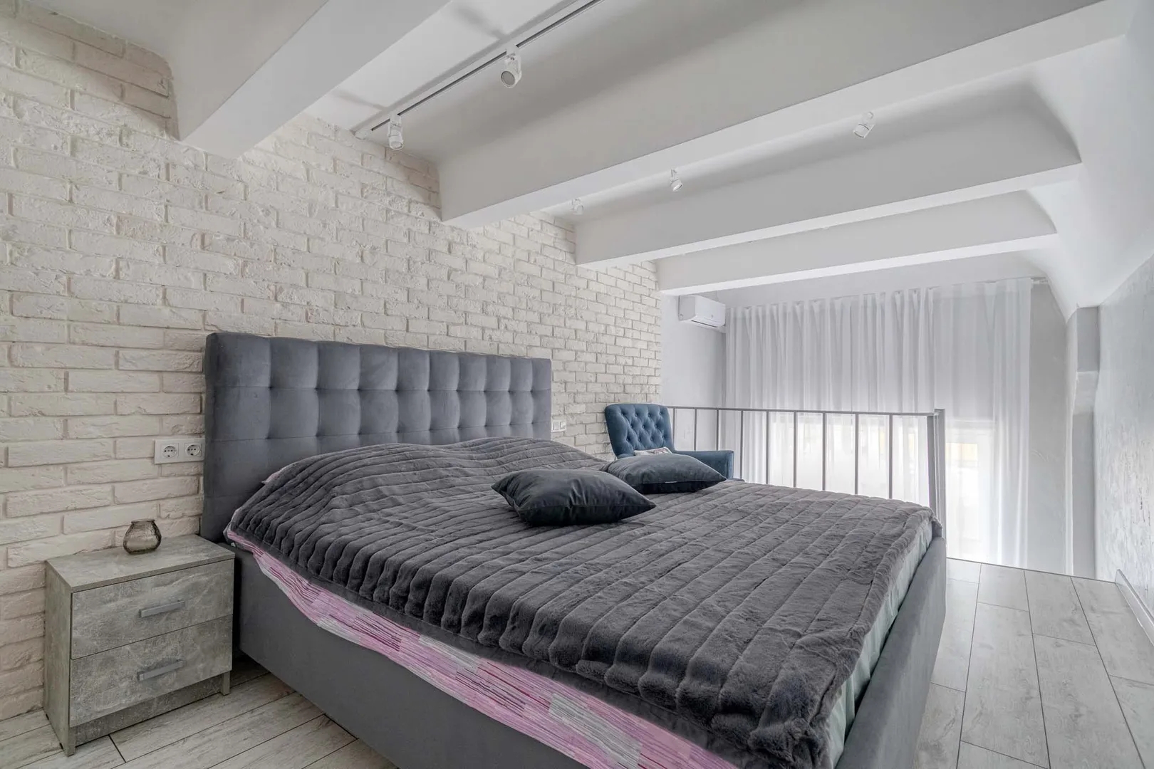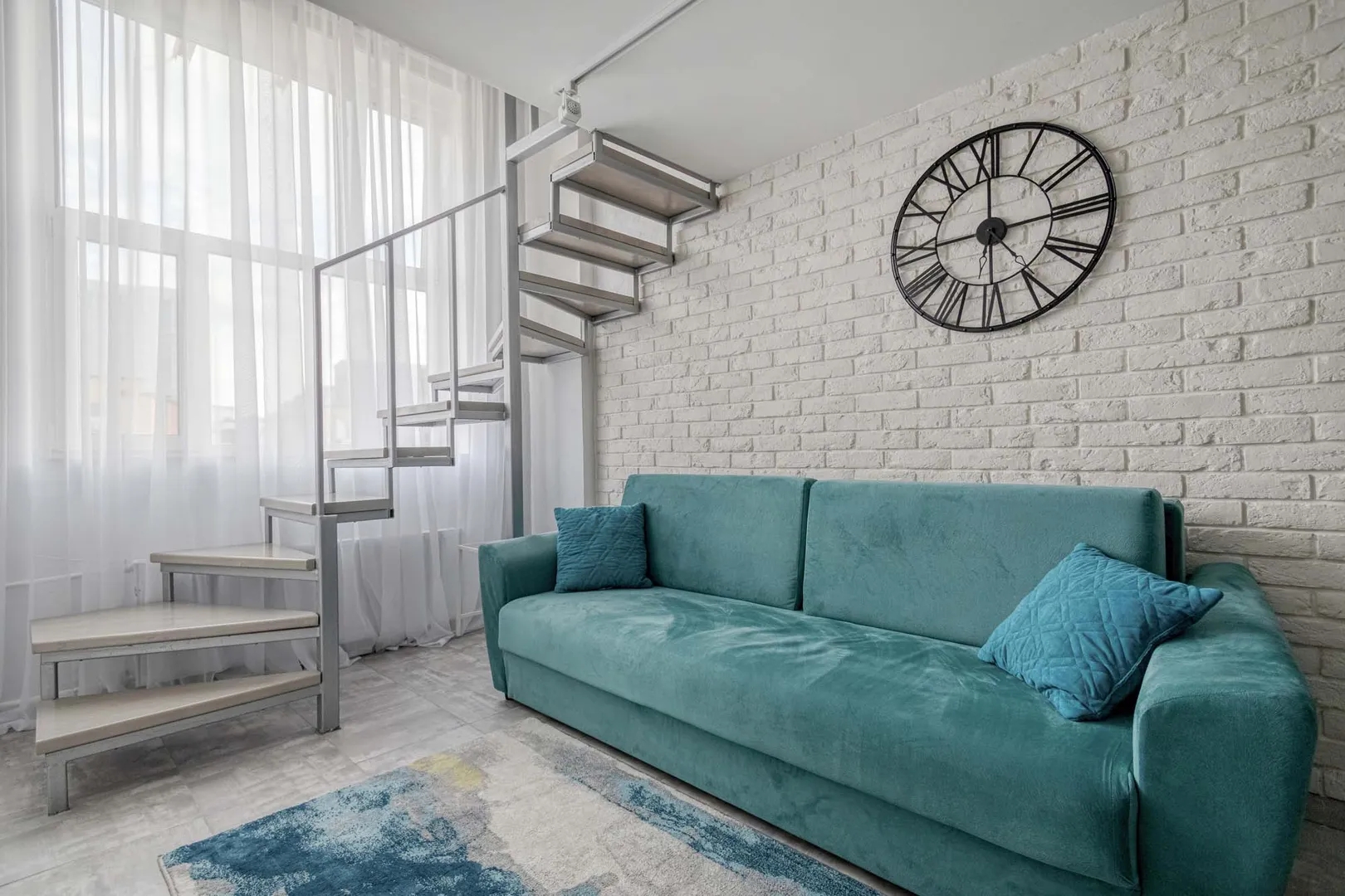 На первом этаже находится кухня-гостиная. Ремонт и мебель подобраны в светлых тонах. В Апартаментах много света благодаря окну высотой в два этажа. Напротив дивана располагается большой телевизор с кабельным телевидением. На втором этаже находится спальня с двуспальной кроватью. В квартире располагаются два санузла: на первом и втором этаже. Хорошее расположение Апартаментов недалеко от центра Москвы прям возле третьего транспортного кольца. Удобно добираться в любой конец города на машине или метро. До метро 12 минут пешком или две остановки на автобусе, который останавливается прям возле дома. Напротив апартаментов находится торговый центр Ривьера. Это большой торговый центр, где можете прогуляться за покупками, сходить покушать в кафе или ресторан. На последнем этаже есть масса развлечений для семей с детьми или для взрослых.
