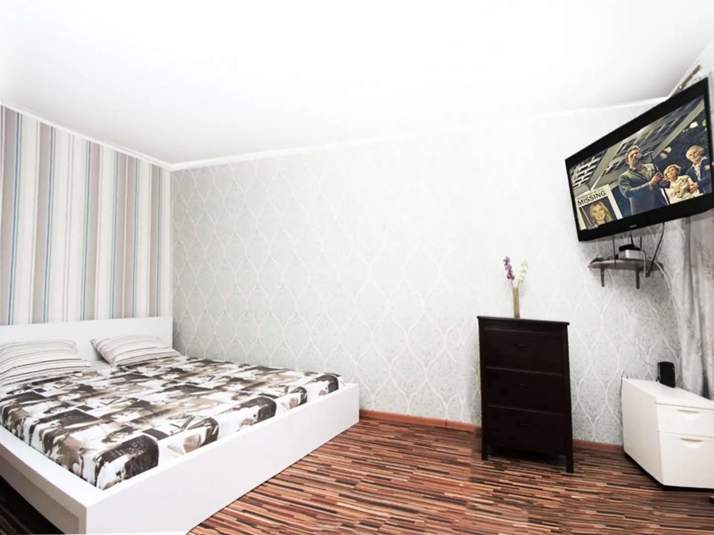 В зале двуспальный раскладывающийся диван, тумба с телевизором, журнальный столик и комод. В спальне удобная двуспальная кровать, подвешенный к стене телевизор, платяной шкаф. На кухне современный гарнитур и обеденная зона. Санузел раздельный, в плитке до потолка, с ванной, евростандарт. В прихожей встроенный шкаф-купе для одежды и полка для обуви. электроплита, кондиционер, металлическая дверь, домофон, свч печь, электрический чайник, утюг с гладильной доской, фен, посуда и принадлежности, телевизор: кабельное тв, постельные принадлежности, уборка квартиры.