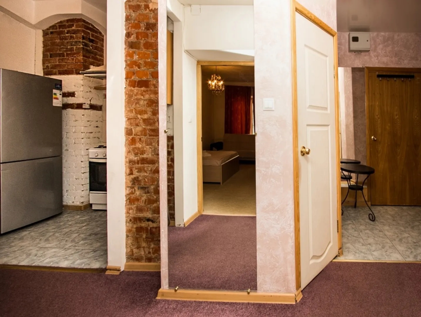 В квартире выполнен дизайнерский ремонт. Первая комната зонирована: двуспальная кровать отделена от второй половины комнаты балдахином. За ним находится односпальный диван, компьютерный стол с офисным креслом. Во второй комнате - двуспальный диван, телевизор с тумбой, платяной шкаф с зеркальной дверью. Кухня выполнена под старину, с выступающей кирпичной кладкой. Кухонный гарнитур дополняется обеденной зоной. Санузел раздельный, с ванной, в плитке до потолка - евростандарт. Газовая плита, кондиционер, металлическая дверь, домофон, свч печь, электрический чайник, утюг с гладильной доской, фен.