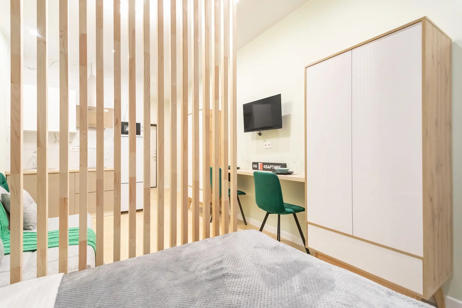 Студия с новым ремонтом недалеко от Метро Филатов Луг. Площадь условно разделена деревянной перегородкой на зону спальни и кухни - гостиной. Спальня с удобной двуспальной кроватью и плотными шторами blackout. Гостиная с диваном, который раскладывается. Тем самым студия удобна для проживания семьи или командировочных. Напротив кровати и дивана есть телевизор со смарт ТВ, а под телевизором находится большой обеденный стол. Студия находится недалеко от Внуково Outlet и также до аэропорта Внуково 10 минут на машине.