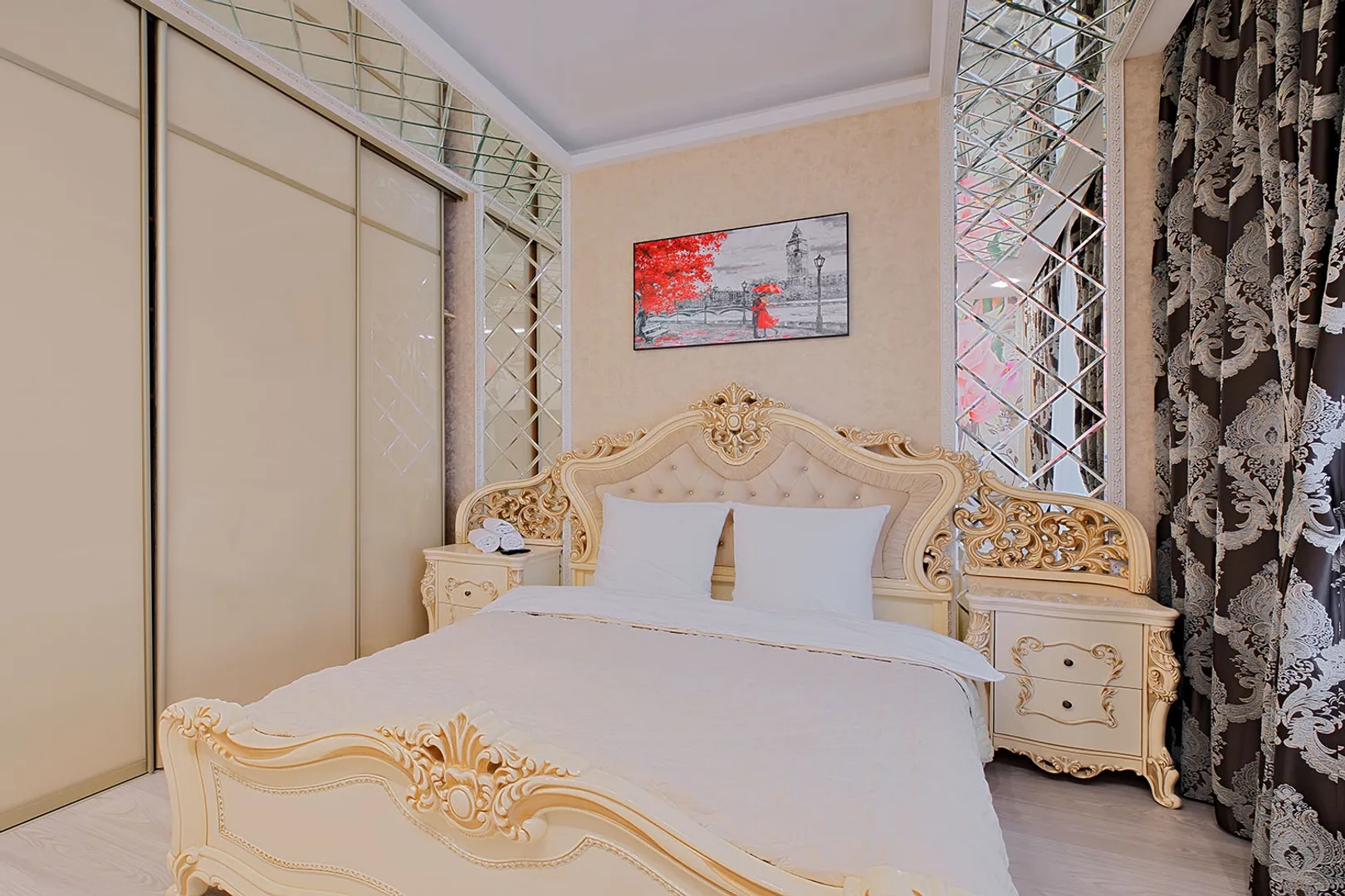 В спальне на кровати лежит удобный ортопедический матрац и пуховое одеяло, с мягкими подушками, для прекрасного отдыха и сна. Вы прекрасно проведёте время в данной квартире в красивой романтической обстановке.