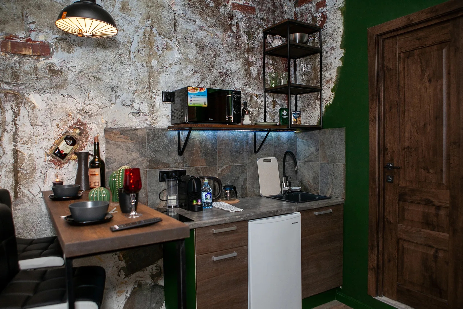 Яркий, необычный апартамент в стиле Гранж в ЖК “Савеловский Сити” с панорамным видом на Москву с 34-го этажа. Сочетание стены из кирпича (настоящая, не муляж), с одной стороны, и наплывов бетона расписанных Художником в стиле Гранж с другой стороны студии создает неповторимые ощущения, которые дополняет окно из душевой в вент-шахту подсвеченную специальным освещением. Все это не отменяет удобств цивилизации в виде 42” телевизора со 100 цифровыми каналами, активной подпиской ivi и двуспальной кроватью с ортопедическим матрасом. Апартамент оборудован кондиционером, кофе машиной, электроплитой, микроволновкой и всем необходимы для проживания. Вместимость: 2 взрослых Размер апартов: 20 кв м Особенности: Неповторимые ощущения от стиля Гранж дополняет окно из душевой в вент-шахту подсвеченную специальным освещением. Остекление – окна в пол.