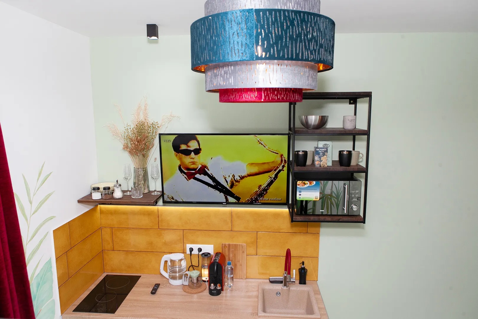 Интересный, нестандартный апартамент в ЖК “Савеловский Сити” с панорамным видом на Москву с 34-го этажа. Кровать прикрепленная к потолку с зоной отдыха под ней. Стену в зоне отдыха Художник расписал растительным орнаментом. В душевой сочетание медового цвета стеклоблоков и плитки с черным керамогранитом создает неповторимые ощущения. Апартамент оборудован кондиционером, 42” телевизора со 100 цифровыми каналами и активной подпиской ivi, кофе машиной, электроплитой, микроволновкой и всем необходимы для проживания. Комфорт обеспечивает двуспальный (140см) ортопедический матрас. Вместимость: 2 взрослых Размер апартов: 18 кв м Особенности: Кровать прикрепленная к потолку с зоной отдыха под ней. Остекление – окна в пол. Этаж: 34