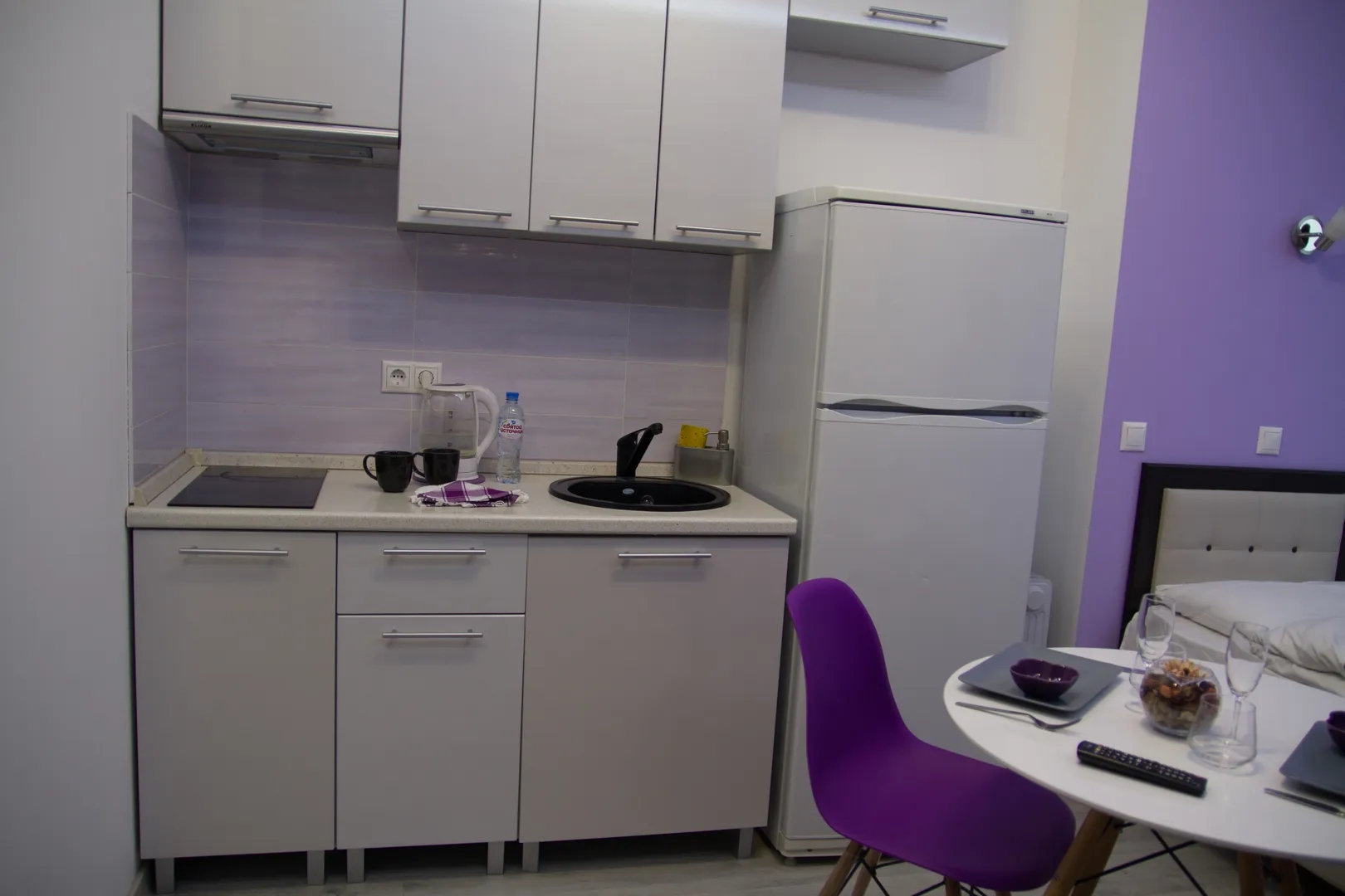 Апартаменты выдержаны в нежно-лавандовых тонах. Студия оборудована мини-кухней с электроплитой и холодильником, обеденной зоной и телевизор с плоским экраном. В распоряжении гостей полностью оборудованная собственная ванная комната с душем, феном и стиральной машиной. Студия располагает двумя односпальными кроватями с ортопедическими матрасами. В проживание включены одноразовые гигиенические средства, кофе, чай, полотенца и бесплатный Wi-Fi. Кровать: две односпальные Вместимость: 2 взрослых Размер апартов: 20 кв м Особенности: Большой холодильник, Душевая комната отделанная мозайкой. Этаж: 15