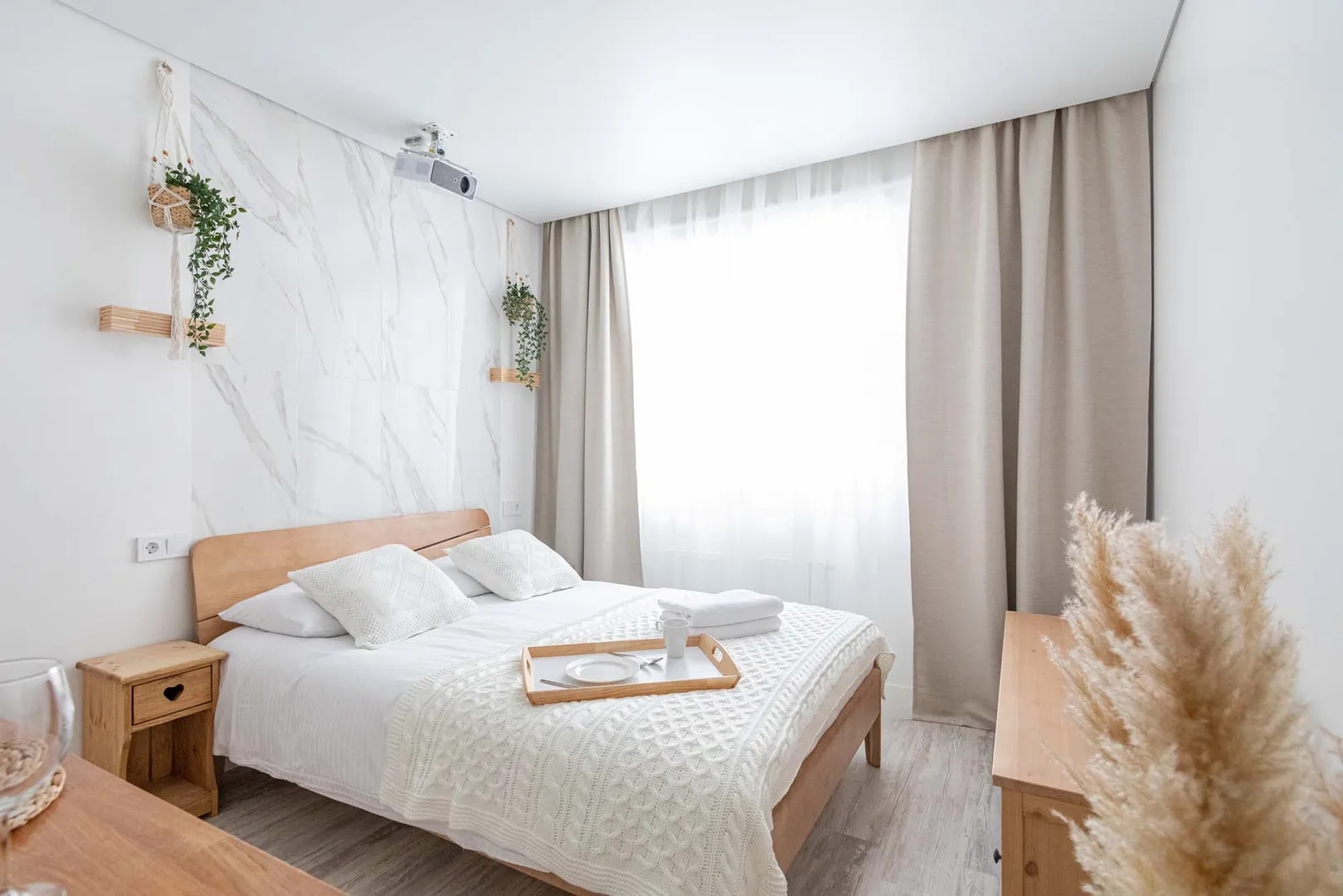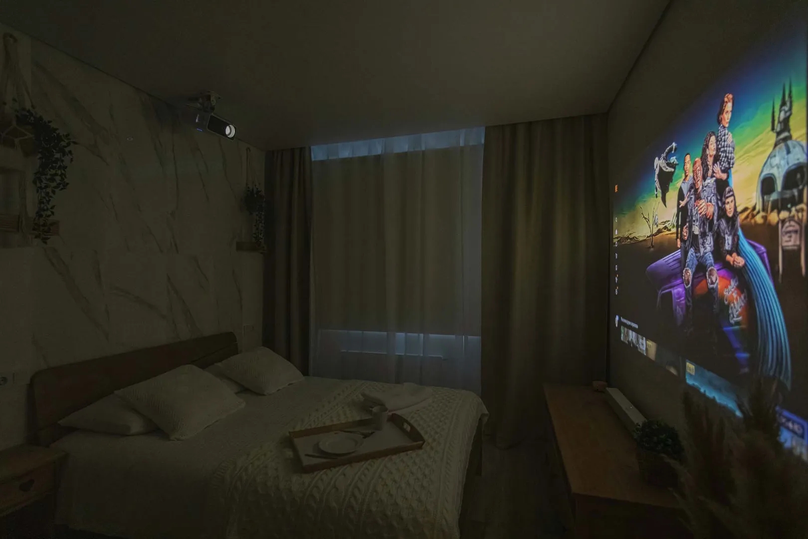 Перед моим увлекательным рассказом я напомню, что в квартире категорически нельзя: - курить - шуметь - двигать мебель - портить имущество Апартаменты - студия в ЖК Нормандия. Название студии The Garden выбрано не случайно - большое количество зеленых искусственных цветов и дерева. Интерьер выполнен в стиле минимализм, об этом расскажем чуть позже.А теперь пойдём по порядку. Вместо телевизора в студии проектор с приставкой "Яндекс Модуль". Домашний кинотеатр реализован в полной мере: проектор, саундбар и ТВ приставка. Одна из фишек интерьера - на стене нет телевизора, только тумба под ТВ осталась. Чтобы любимый сериал можно было смотреть весь день, в квартире установлены рулонные шторы blackout. В дополнение подключена подписка "Яндекс плюс", которая позволяет бесплатно просматривать фильмы из Кинопоиска. Домашний кинотеатр не просто чтобы был, а чтобы кайфовать