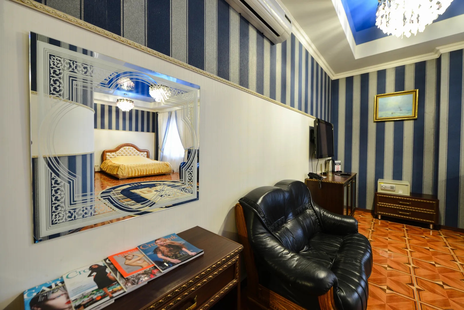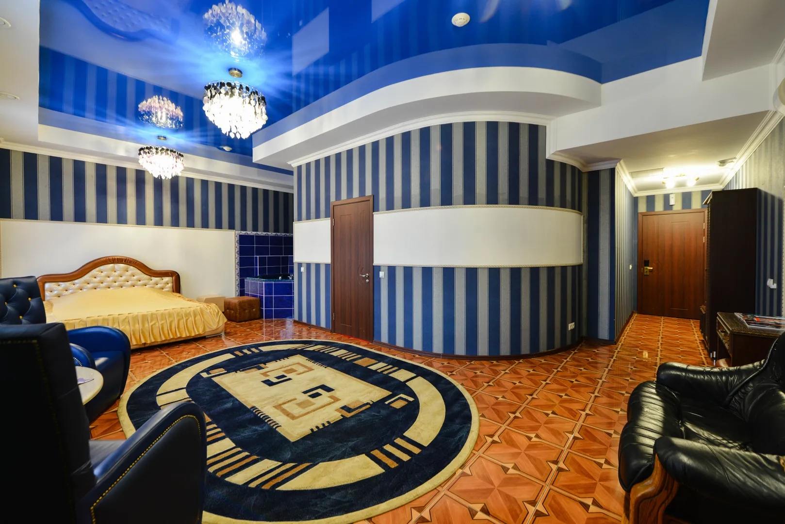 Комфортабельный просторный номер с джакузи. Отдельная ванная комната с душевой кабиной. Включены предметы гигиены, два халата, тапочки, фен. Двуспальная кровать 1,80х2м, кресла с журнальным столиком, туалетный столик, плазменный телевизор, кондиционер, сейф, мини-бар, чайник, столовая посуда, чай, кофе, сахар.