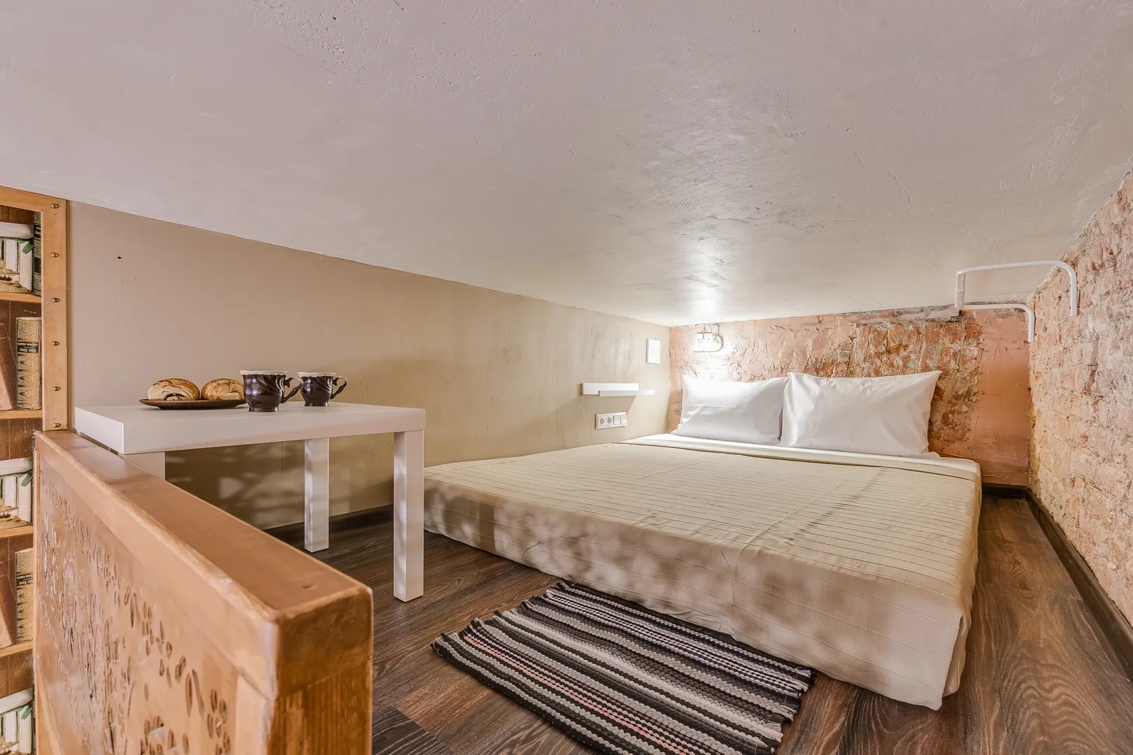 В студии имеется мини-кухня с холодильником, чайником, индукционной плиткой и специальной посудой для быстрого приготовления завтрака и приёма пищи. В студии располагается удобный санузел с душем. На втором уровне - спальная зона с большим ортопедическим матрасом, на 1 этаже находится раскладной диван. Также вы можете воспользоваться откидным столиком, удобным как для работы, так и для приема пищи. Для хранения вещей предусмотрены комод и вешалка с плечиками. Удобства: - Чистое постельное бельё; - Одеяла, подушки; - Комплект полотенец по количеству гостей; - Туалетная бумага; - Гель для душа, шампунь, жидкое мыло; - Собственная кухня; - Стол; - Стулья; - Индукционная плита; - Посуда для приготовления пищи; - Чашки, тарелки, столовые приборы; - Заварной чайник; - Микроволновая печь; - Чайник; - Средство для мытья посуды и губки; - Сушилка для белья; - Раскладной диван-кровать; - Плед и диванные подушки; - Фен; - Утюг и гладильная доска; - Стиральная машина; - Швейный набор; - Аптечка; - Информация для туристов; - Ножницы; - Средства для чистки обуви; - Роллер для чистки одежды. Доступна наличная оплата. Внимание: взимается депозит 3000 рублей за номер. При размещении оказываются качественные сервисные услуги по согласованию: трансфер, питание, дополнительное оснащение номера. Время прибытия: с 14:00 до 23.00 . Время выезда: с 9.00 до 12:00.