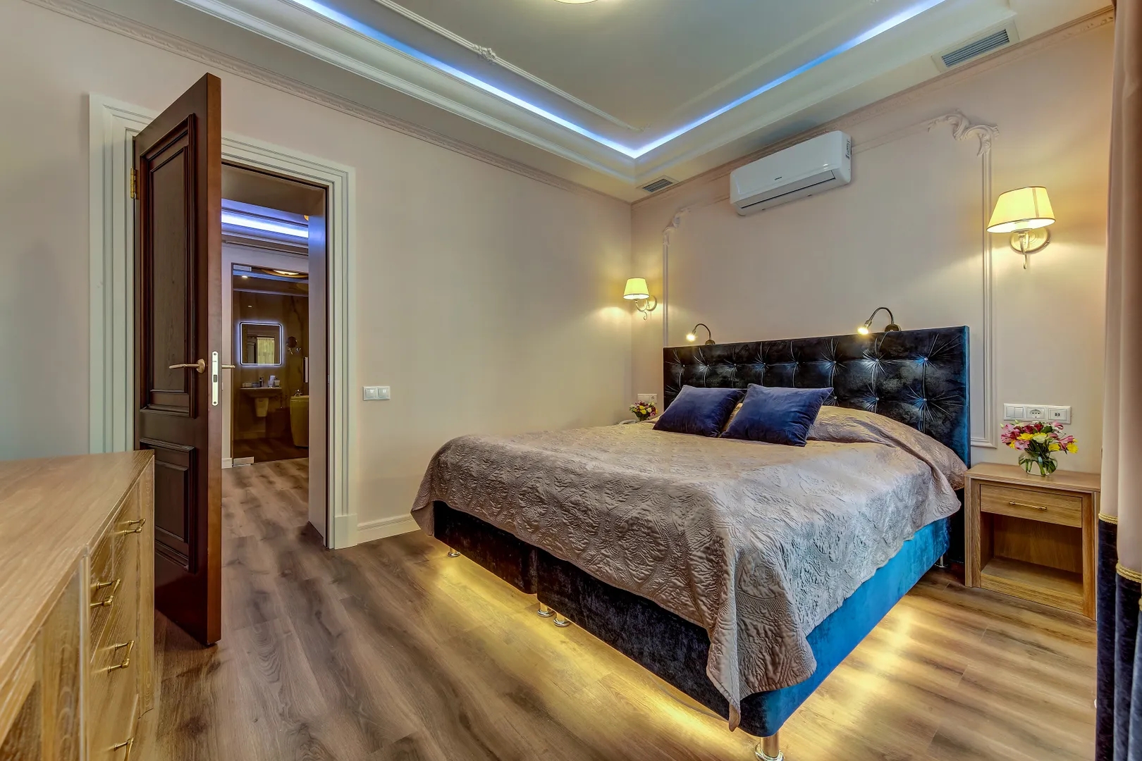 Великолепный номер для Гостей, которые привыкли получать лучшее. Дизайн и функциональность комнат продуманы до мелочей, чтобы сделать Ваш отдых незабываемым. Площадь 45 кв. м. Номер состоит из 2 комнат, в каждой кондиционер и телевизор. Кровать king-size. В ванной комнате инфракрасная кабина и гидромассажная ванна, просторная душевая. Ежедневное пополнение питьевой воды, чайных и кофейных принадлежностей. Ванная комната комплектуется косметикой Skin Essential, халатами и тапочками. Дополнительно может быть установлена детская кроватка.