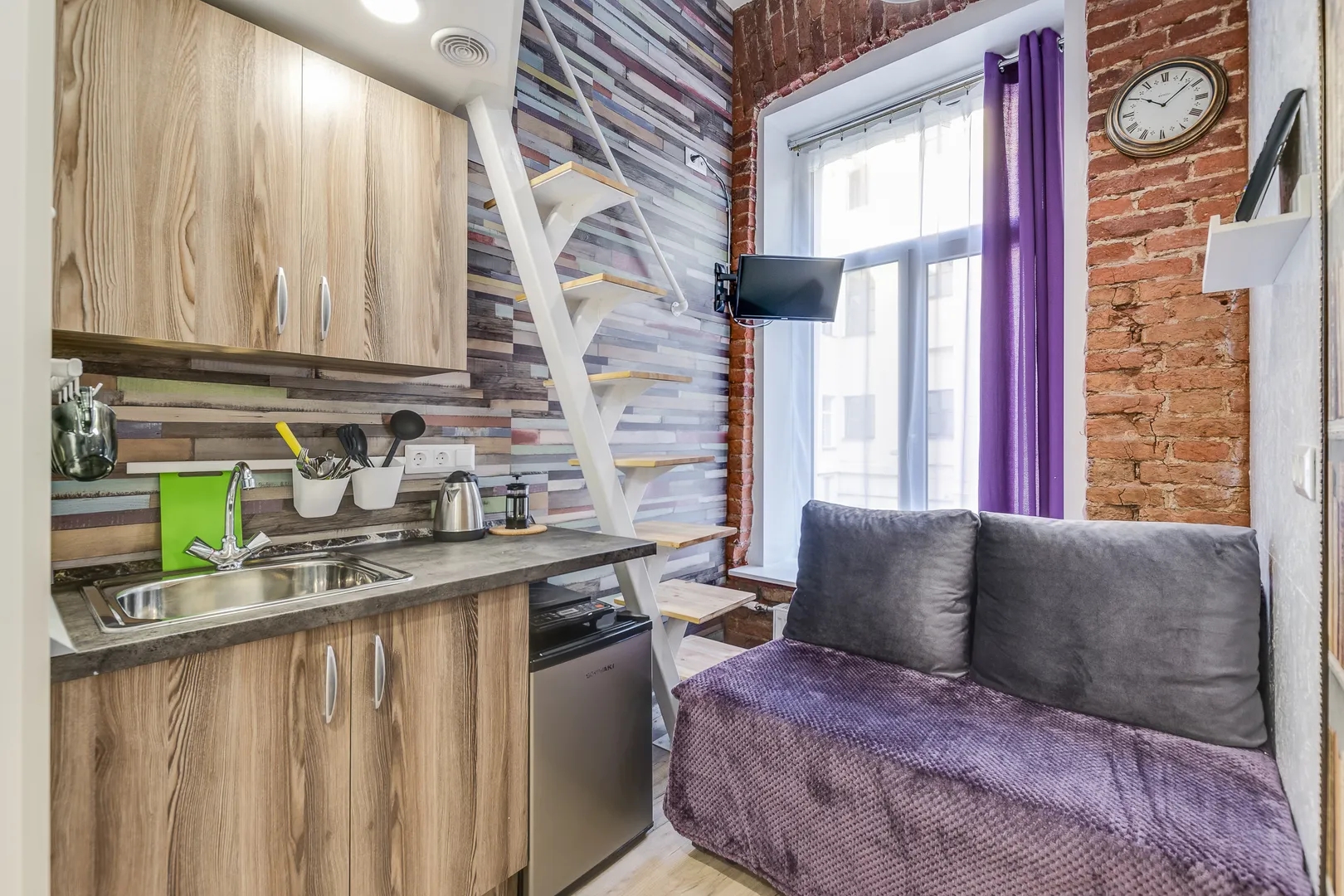 Уютная студия в самом центре Санкт-Петербурга, оснащенная самой современной мебелью и оборудованием для комфортного проживания: на втором уровне - большая постель с ортопедическим матрасом, а внизу расположен санузел, гостиная и кухня. Имеется раскладной диван. Студия полностью автономна: своя мини-кухня оснащена индукционной плиткой и специальной посудой для быстрого приготовления завтрака и приёма пищи. В студии располагается санузел с душем. Гостям предоставляется wi-fi, фен, свежее постельное бельё, комплект полотенец по количеству гостей, моющие средства, одноразовые салфетки, бесплатные туалетно-косметические принадлежности, чай, кофе, сахар, соль. В каждой студии есть бесплатные средства для чистки одежды и обуви, дополнительный удлинитель для электрических приборов, зонт и сушилка для обуви. В общей зоне расположена гладильная доска, стиральная машина, кофеварка, кулер, микроволновая печь. По вопросам парковки можно уточнить у администратора. Удобства: - Чистое постельное бельё; - Одеяла, подушки; - Комплект полотенец по количеству гостей; - Туалетная бумага; - Гель для душа, шампунь, жидкое мыло; - Собственная кухня; - Стол; - Стулья; - Индукционная плита; - Посуда для приготовления еды; - Посуда для употребления еды (чашки, тарелки, столовые приборы - по количеству гостей); - Заварной чайник; - Микроволновая печь; - Чайник; - Средство для мытья посуды и губки; - Сушилка для белья; - Раскладной диван-кровать; - Плед и диванные подушки; - Фен; - Утюг и гладильная доска; - Стиральная машина; - Швейный набор; - Аптечка; - Информация для туристов; - Ножницы; - Средства для чистки обуви; - Роллер для чистки одежды. Центральный район Петербурга - это центр развлечений, культурной и ресторанной жизни Петербурга, а район Пяти углов - насыщена ресторанами, кафе, салонами красоты, кондитерскими, мелкими магазинами. В ресторанах представлены кухни многих народов:грузинские, украинские, узбекские, вегетарианские, русские, индийские. В 3 минутах ходьбы знаменитая улица Рубинштейна, являющаяся второй ресторанной улицей Европы, проживать на ней может показаться слишком шумно, но прогуляться - одно удовольствие. В шаговой доступности есть несколько недорогих отличных столовых и продуктовых супермаркетов. Неподалеку находится Кузнечный рынок, где можно пройтись вдоль рядов и приобрести недорого свежие продукты. По дороге к ближайшей станции метро , что расположена в 2-х минутах ходьбы, расположен дом-музей знаменитого русского писателя Федора Михайловича Достоевского. Также рядом крупнейшие торгово-развлекательные центры "Галерея" и "Стокманн". Мы находимся всего в 15 минутах ходьбы от Московского вокзала, где есть остановка автобусов до Хельсинки. И неподалеку от нас располагается главная артерия Петербурга - Невский проспект со своими уникальными достопримечательностями: театры, музей, каналы, соборы, Дворцовая площадь с Эрмитажем и многое-многое другое.