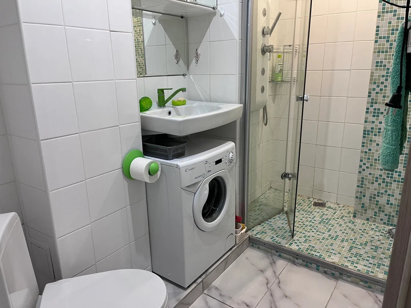 Кухонный гарнитур с холодильником, вытяжкой и эл. Плитой, стол и 4 стула, шкаф в прихожей зоне, двухспальная новая кровать с хорошим матрасом, телевизор, шкаф для белья и односпальная кровать, находящаяся в отдельной отгороженной от общего пространства зоне с окном. Есть стиральная машинка, фен, утюг и гладильная доска, сушилка для белья на балконе и кондиционер
