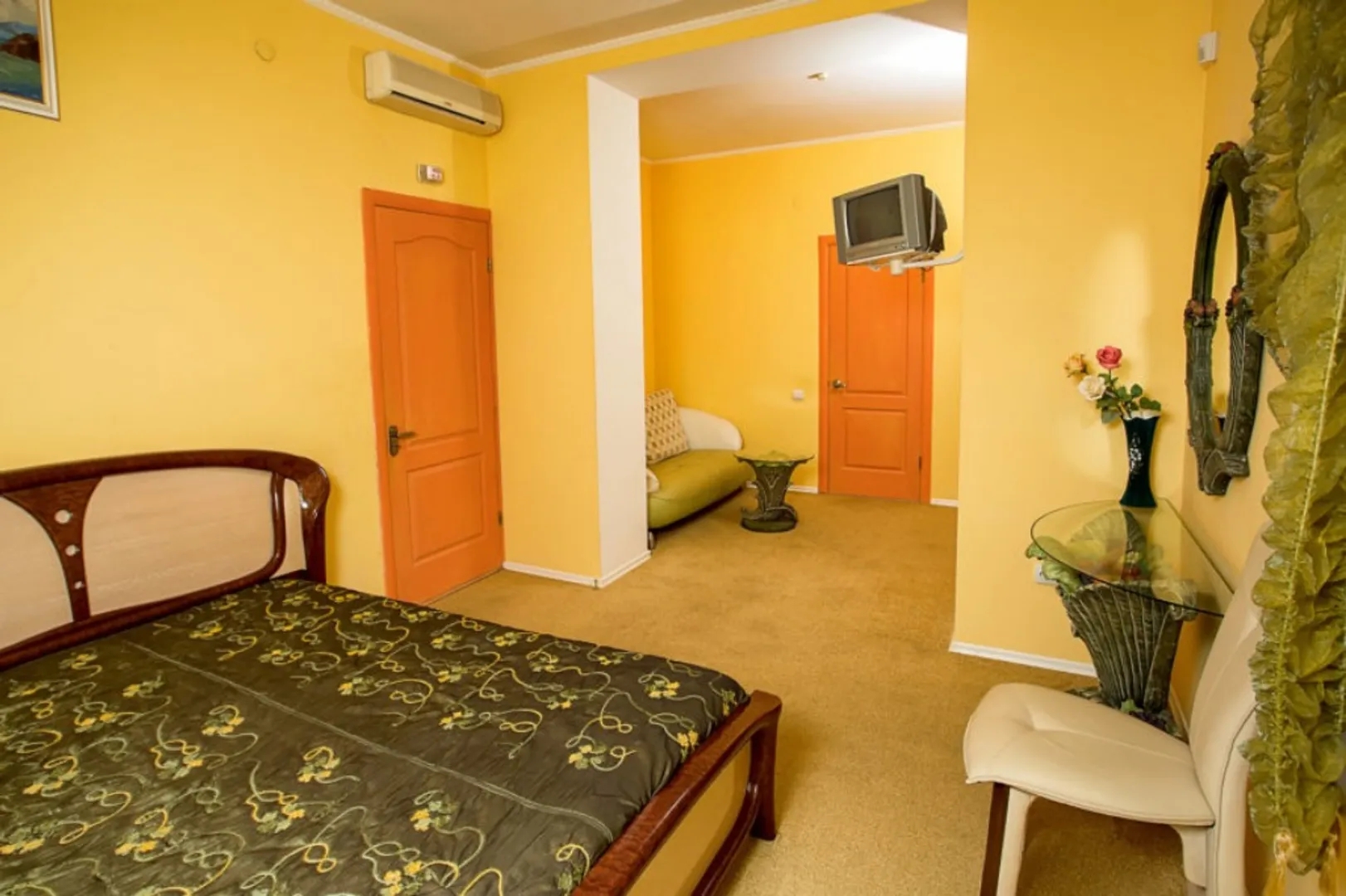 В номере двуспальная кровать, диванчик, холодильник, кондиционер, телевизор, санузел с душем, набор посуды для банкета, Постельное белье и полотенца