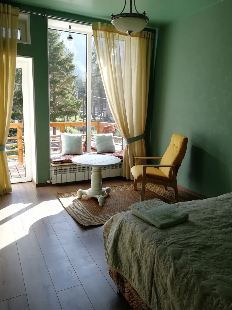 Апартаменты с комфортными и уютными двумя спальнями и кухней гостиной, с панорамными окнами и большим балконом с видом на снежные горы и сосновый лес. Удобно размещение 4 человек, плюс одно дополнительное место, в самый раз для двух пар или большой семьи. Своя кухня-гостиная с газовой печкой и всеми необходимыми принадлежностями. Две спальни с оригинальным ремонтом, две большие двуспальные кровати, журнальный стол, комод, кресло, панорамные окна с подоконниками-диванами с подсветкой и зарядкой для гаджетов. Своя парковка. Мангальная зона. До палян Чегет и Азау 3-5 минут. Рядом проходят ЭКО-тропы. Тихое место, удобный подъезд, кафе, бани, магазины в пешей доступности.